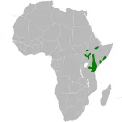 It has a patchy but quite extensive range in equatorial eastern Africa. It occurs within Ethiopia, Kenya, Somalia, South Sudan, Tanzania and Uganda, and its estimated global extent of occurrence is 660,000 km2.[1] Its total population has yet to be quantified, but is believed to be large.[1]