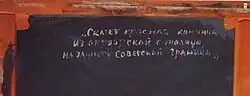 Red Cavalry Riding (Russian: Скачет красная конница) is an oil on canvas painting of around 1932 by the Russian avant-garde artist Kazimir Malevich. It depicts Red Cavalry horsemen racing across a plain, the ground beneath them illustrated with Suprematist stripings of color. It is considered Malevich's only contribution into the official pantheon of Soviet art. Its recognition by the Soviets was ensured by the "politically correct" title of the painting. In addition, Malevich intentionally put "18 год" ("Year 18") in the lower right corner and wrote a short verse on the back: "Скачет красная конница из октябрьской столицы, на защиту советской границы" ("From the capital of the October Revolution, the Red Cavalry rides to defend the Soviet frontier".[1][2]