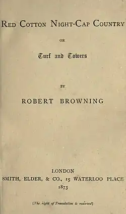Having been originally told about the case of Antoine Mellerio in 1870 by his friend Joseph Milsand, Browning went on to research the facts with great thoroughness, reading newspaper reports and transcripts of the legal documents and interviewing residents of the district.[2] Browning wrote Red Cotton Night-Cap Country during December 1872 and January 1873, while the lawsuit over Mellerio's will was still under appeal. He originally used the real names of the characters and places in the affaire Mellerio, but on submitting the manuscript to his friend Lord Coleridge, then Attorney-General, he was advised that he might be sued for libel. All the names were accordingly changed: Antoine Mellerio to Léonce Miranda, Anna de Beaupré to Clara de Millefleurs, Saint-Aubin to Saint-Rambert, and so on.[3] The poem was published during the first week of May 1873 by Smith, Elder & Co., but they did not need to reprint it until, in 1889, along with The Inn Album, it formed volume 12 of his Poetical Works.[4]