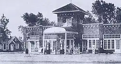 Buck agreed in principle with the idea of a long rest, but disagreed with the choice of Kansas City because the bloody Kansas City Massacre of some weeks earlier meant that numerous federal, state, and local police officers were seeking gangsters in the area. The brothers fought bitterly about the plan before lapsing into a toxic silence that enveloped the car.[7] Late that night they pulled in to refuel at Slim's Castle, a service station, café, and convenience store at the busy Platte City intersection known locally as "The Junction," and the Red Crown Tourist Court across the street caught Clyde Barrow's eye. What attracted him initially was the sturdy brick construction of the place, which made him feel secure, he told his family later.[8] He told his hot, dirty, agitated passengers, "This is where we stay the rest of the night, even if we all get killed before morning."[9]