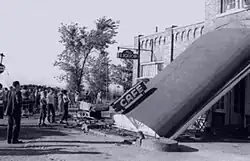 The posse assumed this was a cease-fire signal and they did just that. Many fell back. One headlight had been shot askew into a straight-up beam,[36] and Highfill decided his machine was just not up to this particular challenge, so he backed it away from the action, and the cabins' garages were no longer barricaded. To add to the confusion, an officer back behind the cabins fired off a tear gas rocket that overshot the cabins considerably, and came down across the road in the Slim's Castle parking lot—with the gas then blowing back over the officers on the Red Crown side.[37]