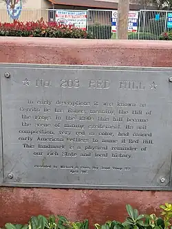 - 'No. 203 RED HILL, In early descriptions it was known as Cerrito de las Ranas, meaning the Hill of the Frogs. In the 1890s this hill became the scene of mining excitement. Its soil composition, very red in color, had caused early American settlers to name it Red Hill. This landmark is a physical reminder of our rich State and local history.' Presented by: Michael B. Cross, Boy Scout Troop 323, April 2005 [4][5]
