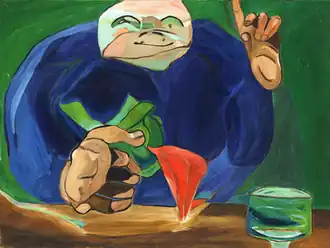 Arobateau painted in a contemporary and expressionist style, incorporating symbolic and surreal imagery into his works.[32][33][34] He painted portraits and animals, and on subjects of spirituality and religion.[35] Arobateau practiced social artistry through paintings, such as portraying exploitation of labor in The Pig (1969).[36] Arobateau often used "pig" metaphorically as a derogatory term in his prose to refer to things such as a self-critical internal monologue and internalization of external pressures. Stacey Cherie Moultry interpreted The Pig in relation to Arobateau's literary "pig", and said that the painting portrays "a seemingly congenial persona who works into one's good graces long enough to gain trust before administering unconstructive criticism."[37]