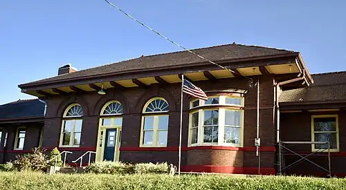 The single story, red brick structure, Late Victorian architectural style, is located on an embankment alongside the elevated tracks on the south side of town. It is .5-mile (0.80 km) south of where the previous depot was located.[2] Passenger service ended in 1971, and the railroad sought to demolish the depot in 1993. It was donated to the community in 1995, and added to the National Register of Historic Places in 1999.[1]