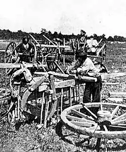 The cart, constructed of native materials, could easily be repaired. A supply of shaganappi and wood was carried as a cart could break a half-dozen axles in a one-way trip.[58] The axles were unlubricated, as grease would capture dust which would act as sandpaper and immobilize the cart.[58][60][61] The resultant squeal sounded like an untuned violin, giving it the sobriquet of "the North West fiddle". One visitor wrote that "a den of wild beasts cannot be compared with its hideousness".[62] The noise was audible for miles.[63] The carts were completely unsprung, and only their flexible construction cushioned the shocks transmitted from the humps and hollows of the trail.[64]