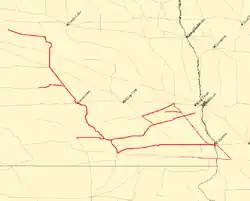 ![]() Route map of the RRVW. Solid lines are trackage owned by the railroad; dotted lines are those with trackage rights. | |