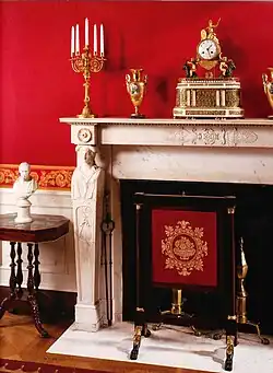 The fireplace mantel was one of two originally purchased by President James Monroe in 1817. Carved of white marble in France in the Empire style, it and its partner originally were installed in the State Dining Room. In 1902, President Theodore Roosevelt selected Charles Follen McKim of the New York architectural firm McKim, Mead & White to renovate the White House. McKim fashioned all new mantels for the State Dining Room, and reused one of the 1817 mantels in the Red Room.[3] The walls were hung with burgundy silk velvet. A late nineteenth century suite of stuffed Turkish-style furniture was upholstered in the same shade.