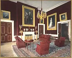 Gilbert Stuart's portrait of George Washington originally hung in the Red Room, providing the colloquial name the "Washington Parlor." Stuart's 1804 portrait of Dolley Madison also was hung here.