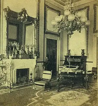 ![]() A stereograph view of the Red Room looking northwest, during the administration of Rutherford B. Hayes. The Philadelphia-built Schomacker grand piano previously in the Red Room, purchased by Mary Todd Lincoln in 1861, was removed in 1877 and replaced by President Hayes' Hallet and Davis upright piano, seen here in the corner.[1] The center table, and "ladies' chairs" (one near the north door) were built by the Herter Brothers. | |