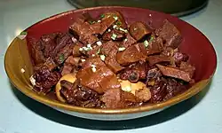 Red cooking, also called Chinese stewing, red stewing, red braising, or flavor potting, is a slow braising Chinese cooking technique that imparts a reddish-brown coloration to the prepared food. Red cooking likely originated in Jiangsu province.[1][2][3] While the technique is used all over China, it is most strongly associated with the Jiangnan region.[4]