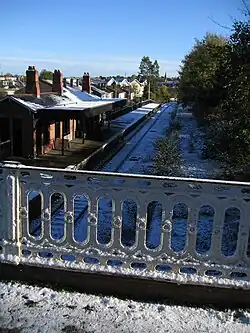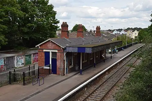Facilities at the station are minimal – there are a few chairs and timetable information is provided. Help points, giving next train information, were installed in 2010. There is no ticket office, but a self-service ticket machine is available.[6] As of 2024, a new display for live train times was installed, providing information for rail users. The Victorian-era station building is the only original station building left on the line,[7] decorated with a mural painted by local students,[8] it is used as an upholsterer's showroom rather than for railway purposes.[9] Access is step-free from South Road, through an area containing residents' garages. The platform backs onto the gardens on the south side of the road.[6]