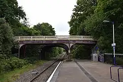 Redland railway station is on the Severn Beach Line, serving the areas of Cotham and Redland, Bristol. The surrounding area is mostly residential, with some commercial premises to the east. A park and tennis centre are directly to the south.[1] The station is located 3 miles 25 chains (5.3 km) along the line from Bristol Temple Meads, and 10 miles 18 chains (16.5 km) from Severn Beach.[2][3][note 1] It is the fourth station from Temple Meads.[4] There is a single 130-yard (120 m)-long platform which serves trains in both directions, situated on the north side of the track and angled at 062 degrees.[1] The station's southern platform was abandoned in 1970 and is overgrown.[5]