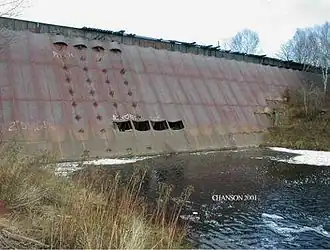 The dam operated for several decades, until the mines closed. After that time, the dam was no longer maintained. On Easter morning of 1941, the spillway behind the dam broke, causing a flood. There was little damage to the steel part of the dam, but with the mining operations stopped, the dam owners had the spillway valves opened. However, there were still incidents of overtopping,[2] and the Copper Range Company (successor to Atlantic Mine Company and owner of the dam) had large holes cut in it in 1979 so that it would not retain water. This lowered the level of the reservoir, revealing the earlier timber dam.[3]