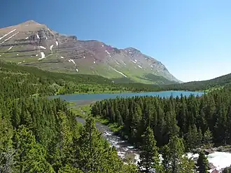 ![]() Redrock Lake, from above Redrock Falls looking towards Mount Henkel and Altyn Peak. | |
