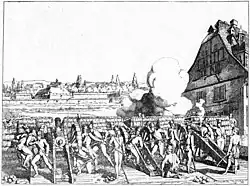 One notable exception was Huningue and its governor General Barbanègre who commanded a garrison of only 500 men against 25,000 Austrians.[4] On the 28 June shortly after word of Napoleon's abdication became known, and the French Provisional Government had requested a ceasefire, Barbanègre ordered the bombardment of neighboring Swiss Basel, something that contemporaries on the Seventh Coalition side considered to be a war crime.[6] At its surrender to the Austrians on 26 August 1815, the city was a ruin and the fortifications were demolished under the terms of Article III of the Treaty of Paris (1815) at the request of Basel.[7]