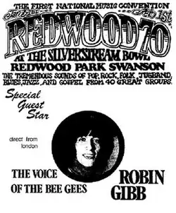 The Redwood 70 National Music Convention, commonly referred to as Redwood 70, was a music festival held on Auckland Anniversary Weekend in Swanson, West Auckland, New Zealand in 1970. Held six months after the Woodstock festival in the United States, Redwood 70 was the first modern multi-day pop music festival held in New Zealand. Headlined by Robin Gibb of the BeeGees with a line-up of predominantly New Zealand musicians, Gibb and his backing orchestra were pelted by objects from the crowd. While the concert did not turn a profit, it popularised the modern multi-day music festival in New Zealand.