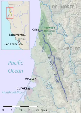 Redwood Creek (Yurok: 'O'rekw 'We-Roy [4]) is a 61.8-mile (99.5 km) river in Humboldt County, California. The river's headwaters are in the Coast Range at about 5,000 feet (1,500 m) and it flows roughly northwest until it empties into the Pacific Ocean near the small town of Orick, the only development in the 280-square-mile (730 km2)-watershed.