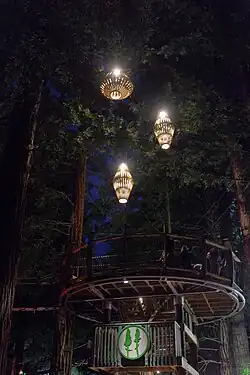 The area, also referred to as "Redwood Memorial Grove",[1] is now protected and has become popular for recreational use, containing mountain bike tracks and the Redwoods Treewalk canopy walkway suspended between the trunks of the redwood trees. The walkway consists of 23 bridges connecting 22 redwood trees, and is suspended 12 meters above the ground. Above the walkway, wooden lantern sculptures are also suspended between the tall tree trunks. At night time, these are lit up, and coloured spotlights illuminate some of the forest floor vegetation and tree ferns.[4]