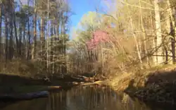 Reedy Creek rises near the WPTF radio towers then flows north into William B. Umstead State Park where it meets Crabtree Creek.[2] The watershed is about 50% forested.[4]