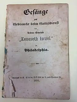 - ^ Wachs, Sharona R, ed. (1856). Gesänge zum Gebrauche beim Gottesdeinst der Reform-Gemeinde "Keneseth Israel" zu Philadelphia (American Jewish Liturgies: A Bibliography of American. Jewish Liturgy from the Establishment of the Press in the Colonies through 1925 (Cincinnati: Hebrew Union College Press, 1997) ed.). Philadelphia: R. Stein. pp. Page 46, Item # 59. ISBN 0-87820-912-3.