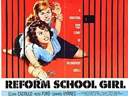 Reform School Girl is a 1957 American drama film starring Gloria Castillo as a teenage girl who is sent to a reformatory.[1][2] The film was directed by Edward Bernds and was produced by Samuel Z. Arkoff. Reform School Girl was one of many exploitation films released by American International Pictures (AIP) during the 1950s and 1960s. AIP's films during this period were largely focused on juvenile delinquency. As part of the AIP formula, young girls were typically depicted as "good" or "bad", the latter of which were petty criminals, gang members, or the girlfriends of gang members. Other AIP films in the same genre included Dragstrip Girl, Hot Rod Girl, and High School Hellcats.[3] Reform School Girl is available for on-line viewing at AMCtv.com.[4] The film was released by American International Pictures as a double feature with Shake, Rattle and Rock.