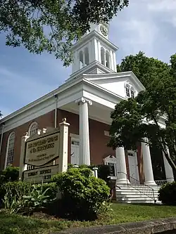 Presenting an impressive façade on North Broadway, the structure's steeple remains the highest point on North Broadway and the tallest physical structure in Tarrytown, despite not being built on the heights of the city. The church's porch of four columns supporting an extended pediment offers a refined architectural addition to the business district of historic Tarrytown.