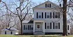 About 400 feet (120 m) to the south, across two parking lots, is the parsonage. It is a three-bay, two-story frame house sided in vinyl with a pedimented front gable and single-bay entrance porch on the northern bay with square piers. The western two bays on the north and south have one-story gabled wings, and there is a two-story porch on the east. Brick chimneys rise from the north end of the north wing and the middle of the south elevation.[1]