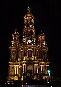 It is a baroque temple of the 18th century that was intervened for the first time in 1907, by Refugio Reyes. The project that he presented in 1919 for the towers was discarded and in 1925 a project proposed by the Inspection of Artistic and Historical Monuments began to be carried out. In 1936 the architect Luis del Refugio Palacios began the execution of a new project that was soon discarded because it was about to collapse. Father Francisco Tiscareño then turned to Refugio Reyes to consolidate the new floor plan, of which no plans have been preserved. Reyes built the lateral naves of the sanctuary, as well as the cubes for the towers, executed in the 70's by an architect who respects Reyes' typology, Víctor Manuel Villegas.[84][82]