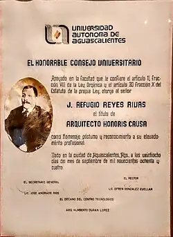 In January 1985 he received the posthumous title of architect from the Faculty of Architecture of the Universidad Autónoma de Aguascalientes[45] and on October 3, 2014 he was declared a favorite son of the municipality of Vetagrande, Zacatecas. He was also inscribed postmortem as a distinguished member of the Colegio de Arquitectos de Zacatecas and, from then on, the cultural hall of Vetagrande was named Refugio Reyes Rivas.[46][47]