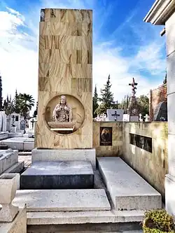 His tomb is located next to that of his wife, Felipa López de Reyes, in the Panteón de la Cruz. The statue of the Sacred Heart of Jesus that decorates the tomb was sculpted by Dionisio Rangel, a disciple and companion of Reyes.[50]