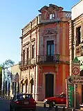 Located right in front of the Cathedral and the Plaza Patria, this characteristic building has diverse architectural elements, from baroque to neoclassical styles: broken pediments, semicircular arches, segmental arches and lintels with circular pediments, among others.[80] In this building the balconies stand out for their artistic ironwork, as well as some French style details, with a worked and intricate masonry work in the columns, frames and lintels,[81][82] as well as the craftsmanship, especially the reliefs of heads, such as the one in the corner opening of the facade, which is in an excellent state of preservation.[83]