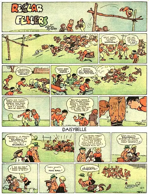 Reg'lar Fellers is a long-running newspaper comic strip adapted into a feature film, a radio series on the NBC Red Network, and two animated cartoons. Created by Gene Byrnes (1889–1974), the comic strip offered a humorous look at a gang of suburban children (who nevertheless spoke like New York street kids). Syndicated from 1917 to January 18, 1949,[3] Byrnes' strip was collected into several books. Branding also extended to such items as baseball bats and breakfast cereal.