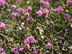 Regelia cymbifolia is a plant in the myrtle family, Myrtaceae and is endemic to the south-west of Western Australia. It is a much branched shrub bearing tiny, wedge shaped leaves and clusters of deep pink to purple flowers on the ends of its branches in spring.