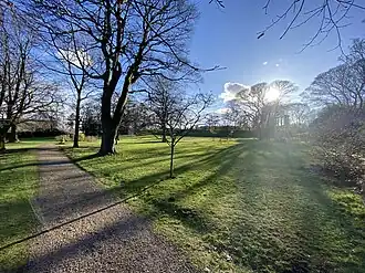 The layout is broadly divided into a large 2.8-hectare (7-acre) area with six distinct lawns and a smaller 2-hectare (5-acre) area of woodland. The lawns are surrounded with several different species of trees, including an avenue of lime trees, and a series of horse chestnuts along a ha-ha near the Calton Hill boundary wall at the top of the grounds. Various paths covered by trees surround the large lawn area. The woodland area is planted with snowdrops, crocuses, daffodils and bluebells.[1][5]