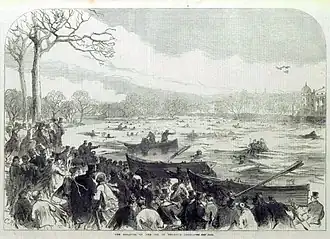 Overnight, the ice refroze and the following day, about 500 people took to the ice with an estimated 2,000 more watching. At 3:30 pm the ice was heard to crack and almost half of the skaters fell into the water. As many could not swim and were wearing heavy clothing, they sank.[1] Those watching attempted to rescue them by launching boats and pulling branches from trees to use as lifelines.[2] Many were rescued unharmed, while survivors with hypothermia and recovered bodies were taken to the nearby Marylebone workhouse.[3] Recovery of all the bodies took several days as the lake kept refreezing and several bodies had to be removed from the bottom of the lake by divers.[4]