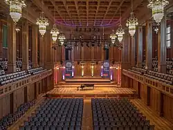 The Max-Littmann-Saal was originally called Großer Saal (Great Hall). After the end of renovation in 2005 it was officially renamed after the architect Max Littmann. The hall of about 455 square meters is 36 meters long, 16 meters high and is surrounded by a large U-shaped gallery. In the case of row seating, the hall accommodates a maximum of 1,160 guests, in the parquet about 660 and on the gallery about 500 seats. It is used for concerts, but also for conferences. Experts count it to the best concert halls of the world.[6] The paneling of cherry-wood gives the hall, which is of the “shoebox type”, a much acclaimed acoustics. Behind the panelling a gap of five to ten centimeters to the wall acts as resonance space. Measurements during the renovation of 2005 brought reverberation times of 1.1 to 1.8 seconds. These acoustics are similar to the Boston Symphony Hall or the Usher Hall in Edinburgh.[7] So the Max-Littmann-Saal often was used for recordings of classical music. In the recent past the Philharmonie Festiva and the conductor Gerd Schaller produced CD recordings of symphonic works of Anton Bruckner,[8] Johannes Brahms, and Franz Schubert,[9] as well as the first recordings of the opera Merlin by Carl Goldmark[10] and the Great Mass by Johann Ritter von Herbeck.[8] Many concerts of the Kissinger Sommer are recorded in the Max-Littmann-Saal by the public broadcasting company Bayerischer Rundfunk. The hall is connected to the neighbouring halls Grüner Saal and Weißer Saal by big foldable doors, which make it possible to enlarge the capacity of the Max-Littmann-Saal.