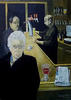 Gray had a studio on Leeson Street in the early 1950s. There he made a wash drawing of the artist Patrick Swift which he used as a base for a large canvas homage to the painter some years later.[7] Gray's first paid work was a commission by University College Dublin to design the setting and costumes for their production of The King's Threshold by W. B. Yeats. The lead in the play was given to the young actor-poet John Jordan. During the preparations and rehearsals Gray painted a portrait of Jordan which now hangs in the collection of The Dublin Writers Museum. At this point the artist Cecil Ffrench Salkeld ARHA (Associate of the Royal Hibernian Academy) took an interest in Gray, and gave him a room in his Dublin home where Gray studied old master techniques. Salkeld was visited by writers, painters and musicians, such as Brian O'Nolan, Arland Ussher, Francis Stuart, Marten Cumberland and John Beckett, cousin of Samuel. Gray painted John Beckett during this period and the portrait now hangs in St. Columba's College, Dublin, where Beckett had his first music lessons. Gray became a close friend of Brendan Behan and was asked to be best man at Behan's wedding.[2][8] Gray designed many settings for The Pike Theatre[9] including the production of The Rose Tattoo[10] by Tennessee Williams. After the success in Dublin, the play was transferred to The Grand Opera House, Belfast and Gray travelled there to redesign and create the much larger settings need for the bigger stage. Look Back in Anger by John Osborne was at the same time running at the Opera House and Gray befriended and sketched the leading actress Jocelyn Britton. Later he designed the sets for Nekrassov[11] by Jean-Paul Sartre which was mounted at The Gate Theatre. Gray later went on a tour of Ireland with The Dublin Repertory Theatre Company designing their productions, including The Wood of the Whispering by M. J. Molloy.