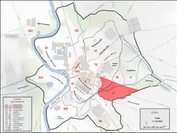 At the turn of the 5th century, the regio was divided into seven vici (districts) and 3,600 insulae (blocks). It had two curators and was served by 48 Roman magistrates.[2]