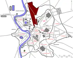 The most prominent building in this region was the magnificent Temple of the Sun built by the emperor Aurelian and dedicated to Sol Invictus. The temple sat on the Campus Agrippae, an area filled with halls and pleasure grounds for the people that had been established by the emperor Augustus.[2] Scattered around this area were the Porticus Vipsania (which contained on one of its walls, a map of the known world), the Porticus Constantini, the Forum Suarium (or Pig Market), and the gardens of the Horti Aciliorum and the Horti Lucullani. It was at the Gardens of Lucullus that the Mausoleum of the Domitii Ahenobarbi sat, where the remains of the emperor Nero were interred.[3]