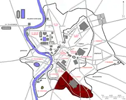 At the turn of the 5th century, the Regio was divided into 17 vici (districts) and 2,487 insulae (blocks). It had two curators and was served by 48 Roman magistrates.[5]