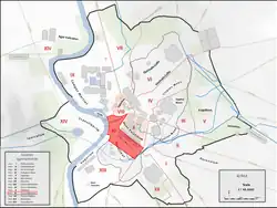 At the turn of the 5th century, the Regio was divided into 19 vici (districts) and 2,600 insulae (blocks). It had two curators and was served by 48 Roman magistrates.[4]