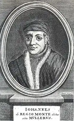 Johannes Müller von Königsberg (6 June 1436 – 6 July 1476[1]), better known as Regiomontanus (/ˌriːdʒioʊmɒnˈteɪnəs/), was a mathematician, astrologer and astronomer of the German Renaissance, active in Vienna, Buda and Nuremberg. His contributions were instrumental in the development of Copernican heliocentrism in the decades following his death.