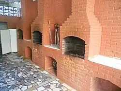 In Brazil, a churrasqueira is often a brick pillar with a grilling space in the middle.[31] In a Brazilian barbecue, a variety of meats, pork, sausage, and chicken are cooked on a purpose-built churrasqueira, frequently with supports for spits or skewers.[32] Portable churrasqueiras are similar to those used to prepare the Argentine and Uruguayan asado, with a grill support, but many Brazilian churrasqueiras do not have grills, only the skewers above the embers. The meat may alternatively be cooked on large metal or wood skewers resting on a support or stuck into the ground and roasted with the embers of charcoal (wood may also be used, especially in the state of Rio Grande do Sul).