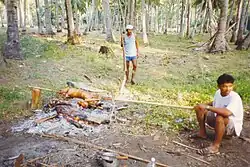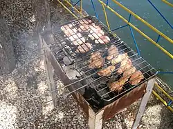 In addition, outdoor barbecues (usually known simply as BBQ) are popular among residents on short trips to regional parks in the countryside.[11] These are invariably charcoal-fired, with marinated pieces of meat, usually beef, pork, sausage or chicken wings, cooked using long, hand-held forks. Honey is brushed on near the end of cooking. At the same time, foil-wrapped pieces of corn and sweet potato are placed on the hot coals; these take a long time to cook, so they are usually eaten at the end of the barbecue.