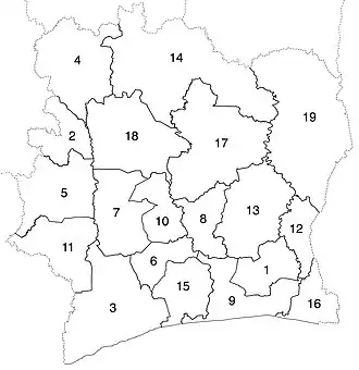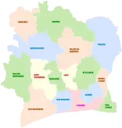 Prior to the 2011 reorganisation of the subdivisions of Ivory Coast, the 19 regions were the first-level subdivision of the country. In the reorganisation, districts were created and replaced regions as the first-level subdivisions and the 19 regions were reorganized into 30.[2][3] In 2012, one region was divided to create a 31st region.[4][5]