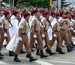 After a brief establishment period during which the Regulares wore white indigenous dress, the new corps was issued with uniforms modelled on those of the French zouaves.[13] During 1913-14 these were replaced by simplified light khaki, worn with red fez caps and sashes.[14] During the 1930s the Regulares were uniformed similarly to the Tiradores de Ifni but without the siroquera.[15][16] A tarbuch was worn, by the native officers and men, with a sand colored shirt and breeches with brown leather equipment. Spanish officers wore a sand colored variant of the standard Spanish Army uniform with a red topped peaked cap.[15]