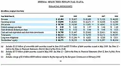 This item asks for selected financial data to be presented, in a comparative columnar form, for each of the last five fiscal years and any additional fiscal years necessary to prevent the information from being misleading.[18] Such financial data should include net sales or operating revenues, income (loss) from continuing operations, income (loss) from continuing operations per common share, total assets, long-term obligations and redeemable preferred stock, and cash dividends declared per common share.[19] The financial data can also include any additional items that would help with understanding the financial condition and results of operations.[20]