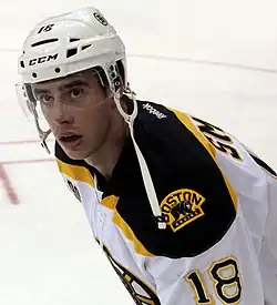 In July 2013, Smith was included in a blockbuster trade between Dallas and the Boston Bruins, which sent him, Loui Eriksson, Joe Morrow and Matt Fraser to Boston in exchange for Tyler Seguin, Rich Peverley and Ryan Button.[23] During the pre-season, Smith was placed on the Bruins' third line with Chris Kelly and Carl Söderberg.[24] However, as a result of injuries, Smith was moved up to a line with Patrice Bergeron and Loui Eriksson.[25] He finished the regular season with 19 goals and 30 assists which included 17 points throughout November. As a result of his success, the New England Sports Network (NESN) TV network named Smith the 45th annual "7th Player." The "7th Player" is awarded to the Boston Bruin who most exceeded all expectations that season, as voted by the team's fans.[26]