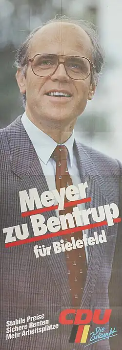 Meyer zu Bentrup was a farmer. He had a farm in Brönninghausen-Bielefeld.[1] At the universities in Berlin and Bonn he studied agriculture. He was a member of the party CDU.[2] From 1976 to 1994 Meyer zu Bentrup was a member of the German Bundestag.[3] He was married.[4]