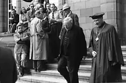 Maier was 1932–1933 a member of parliament for the German State Party. At the same time he was from 1932 to 1933 a member of the Württemberg Landtag. On 23 March 1933, he voted for the Enabling Act together with the other four liberal Reichstag deputies Hermann Dietrich, Theodor Heuss, Heinrich Landahl, and Ernst Lemmer. The final sentence of his speech was: For the sake of people and country and in anticipation of a legitimate development, we will rescind our serious concerns and approve the Enabling Act.[3] According to the informations of Theodor Heuss in his memoirs, the five liberal Reichstag deputies have initially been divided with respect to the Enabling Act. Heuss had formulated two explanations, one for rejection, one for abstention. At his side, however, was only Hermann Dietrich. Heinrich Landahl, Ernst Lemmer and Reinhold Maier voted in the Reichstag group for approval. Heuss and Dietrich were overruled, so then all Liberal MPs voted for the Enabling Act.[4] In the Weimar Republic Maier was a member of the German Democratic Party (DDP). In 1945 he was a founder of the Democratic People's Party (DVP), which is now the Baden-Württemberg-Organisation of the FDP.